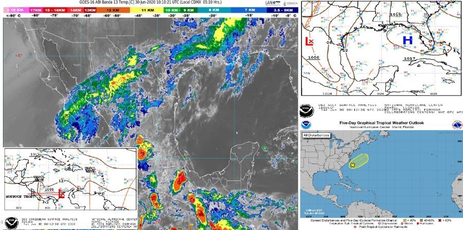 Península de Yucatán: Cielo parcialmente nublado, incremento de nublados por la tarde con intervalos de chubascos en Campeche y Quintana Roo, además de lluvias aisladas en Yucatán, todas con descargas eléctricas. Ambiente caluroso. Viento del sureste de 10 a 25 km/h con rachas de 50 a 60 km/h.