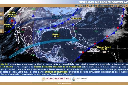 Para hoy, frente frío No. 24 ingresará en el noroeste de México, se asociará con inestabilidad atmosférica superior y la entrada de humedad generada por la corriente en chorro, dando origen a la Cuarta Tormenta Invernal de la Temporada sobre dicha región.