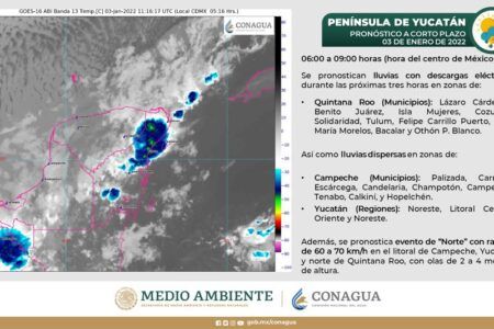 Península de Yucatán: Cielo medio nublado a nublado, con probabilidad de lluvias puntuales muy fuertes en Campeche y lluvias fuertes en Yucatán y Quintana Roo. Ambiente templado gran parte del día. Evento de “Norte” de 20 a 30 km/h con rachas de 60 a 70 km/h a lo largo del litoral.