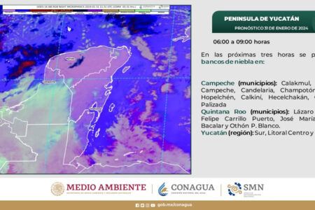 La Comisión Nacional del Agua informó esta mañana que para las próximas horas se pronostican bancos de niebla para los municipios de Lázaro Cárdenas, José María Morelos, Felipe Carrillo Puerto, Bacalar y Othón P Blanco.