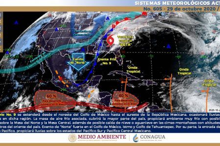 Para hoy, el frente frío No. 9 se extenderá desde el noreste del Golfo de México hasta el sureste de la República Mexicana, ocasionará lluvias puntuales torrenciales en dicha región.