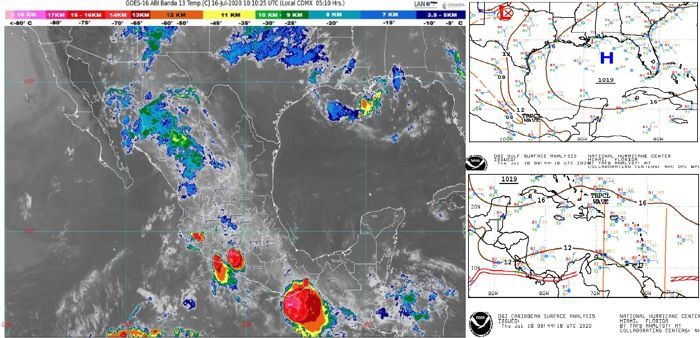 Golfo de México: Cielo parcialmente nublado durante el día, incremento de nublados por la tarde con lluvias puntuales fuertes en Veracruz, chubascos en Tabasco, ambas con descargas eléctricas y posible caída de granizo, además de lluvias aisladas en Tamaulipas. Ambiente caluroso. Viento del este y sureste de 15 a 30 km/h, además de rachas de 50 a 60 km/h con posibles tolvaneras en Tamaulipas.