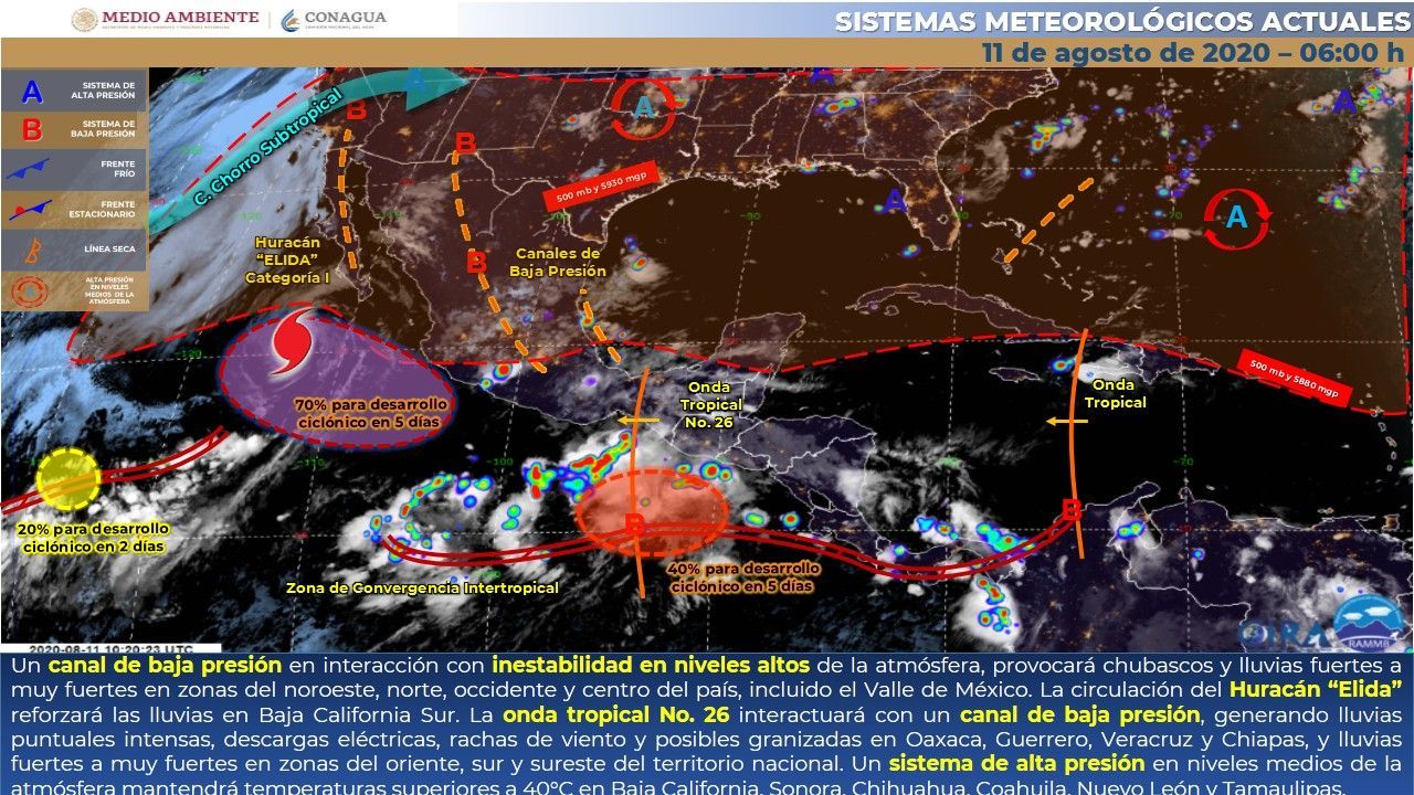 Para la península de Yucatán, se pronostica cielo parcialmente nublado por la mañana, incremento de nublados hacia la tarde y lluvias puntuales fuertes en Yucatán, así como intervalos de chubascos en Campeche y Quintana Roo, todas con descargas eléctricas. Ambiente caluroso. Viento del sureste de 15 a 30 km/h con rachas de 50 km/h en zonas de tormenta.