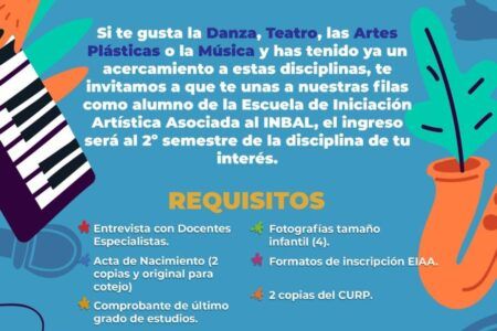 A fin de impulsar el arte y la cultura en niños y jóvenes de 8 a 17 años de edad, el gobierno municipal presidido por Lili Campos Miranda, a través del Instituto Municipal de la Cultura y las Artes, abre la convocatoria de hoy 12 de enero al 20 de febrero para la inscripción al segundo semestre de la Escuela de Iniciación Artística Asociada al Instituto Nacional de Bellas Artes y Literatura (INBAL), que dará inicio el próximo 28 de febrero.
