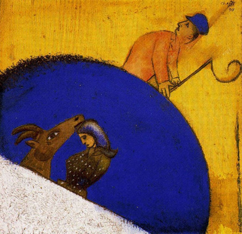 Los animales, la religión, el arte popular ruso, y los temas circenses, se observan frecuentemente en la obra de Chagall, así como la fantasía, los sueños, y la vida cotidiana rural rusa, lugar donde adquirió sus conocimientos artísticos.