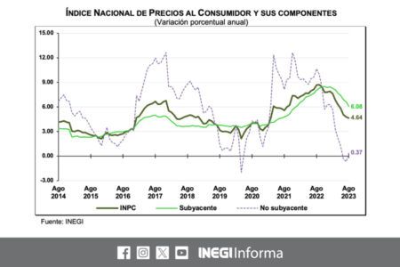 La inflación en México se sigue desacelerando y en agosto de 2023 el Índice Nacional de Precios al Consumidor (INPC) se ubicó en 4.64 por ciento muy por debajo de lo registrado en el mismo mes, pero de 2022, dio a conocer el Instituto Nacional de Estadística y Geografía (Inegi).