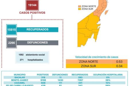 Bacalar cuenta con 318 casos positivos, Benito Juárez 9198, Cozumel 608, Felipe Carrillo Puerto 438, Isla Mujeres 267, José María Morelos 167, Lázaro Cárdenas 384, Othón P. Blanco 4883, Puerto Morelos 41, Solidaridad 2466 y Tulum 374.