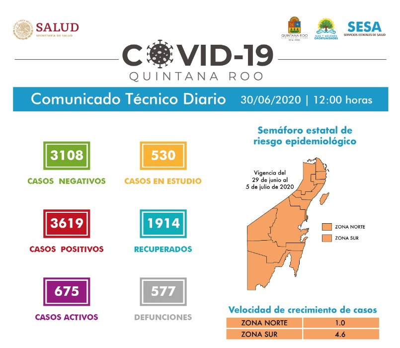 La Secretaria de Salud del Estado de Quintana Roo, Alejandra Aguirre, informó por medio de sus redes sociales que hasta las 12 horas del 30 de junio, se han notificado 3108 casos negativos, 530 en estudio, 3619 positivos, 675 casos activos, 577 defunciones y 1914 personas recuperadas a COVID-19.
