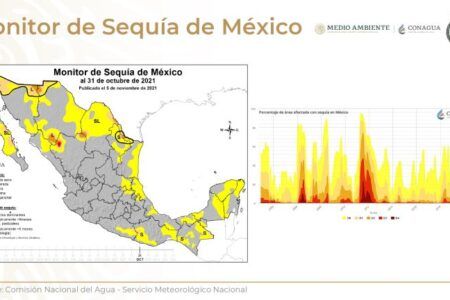 Alerta que el incremento de áreas con sequía de moderada a severa se observó en el norte del país; “en tanto que las condiciones anormalmente secas se extendieron en Tamaulipas, Sonora y la Península de Yucatán. Al 31 de octubre de 2021 el área con sequía de moderada a extrema fue de 7.89 por ciento a nivel nacional, ligeramente menor (0.39 por ciento) que lo cuantificado al 15 de octubre del mismo año”.
