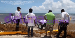 Trabajadores de la empresa Ar.Co intentar succionar con una manguera y una máquina tipo Baxtor el sargazo acumulado frente al parque fundadores del centro de la ciudad.