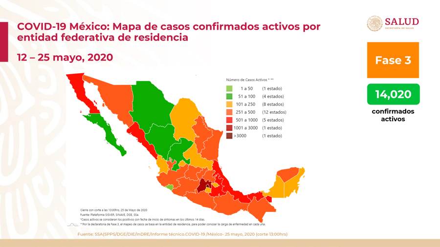 El Dr. Hugo López-Gatell informó en la conferencia de prensa de la tarde de este les que al 25 de mayo de 2020 hay 71,105 casos confirmados, 14,020 confirmados activos y 29,509 sospechosos por COVID-19.
