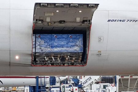 Esta madrugada, a las 2:24 horas, llegaron al Aeropuerto Internacional de la Ciudad de México (AICM) 300 mil dosis de vacunas envasadas Sputnik V contra el SARS-CoV-2.