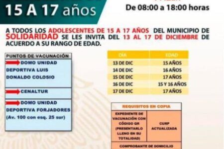 Del 13 al 17 de diciembre la vacuna para jóvenes de 15 a 17 en Solidaridad.
