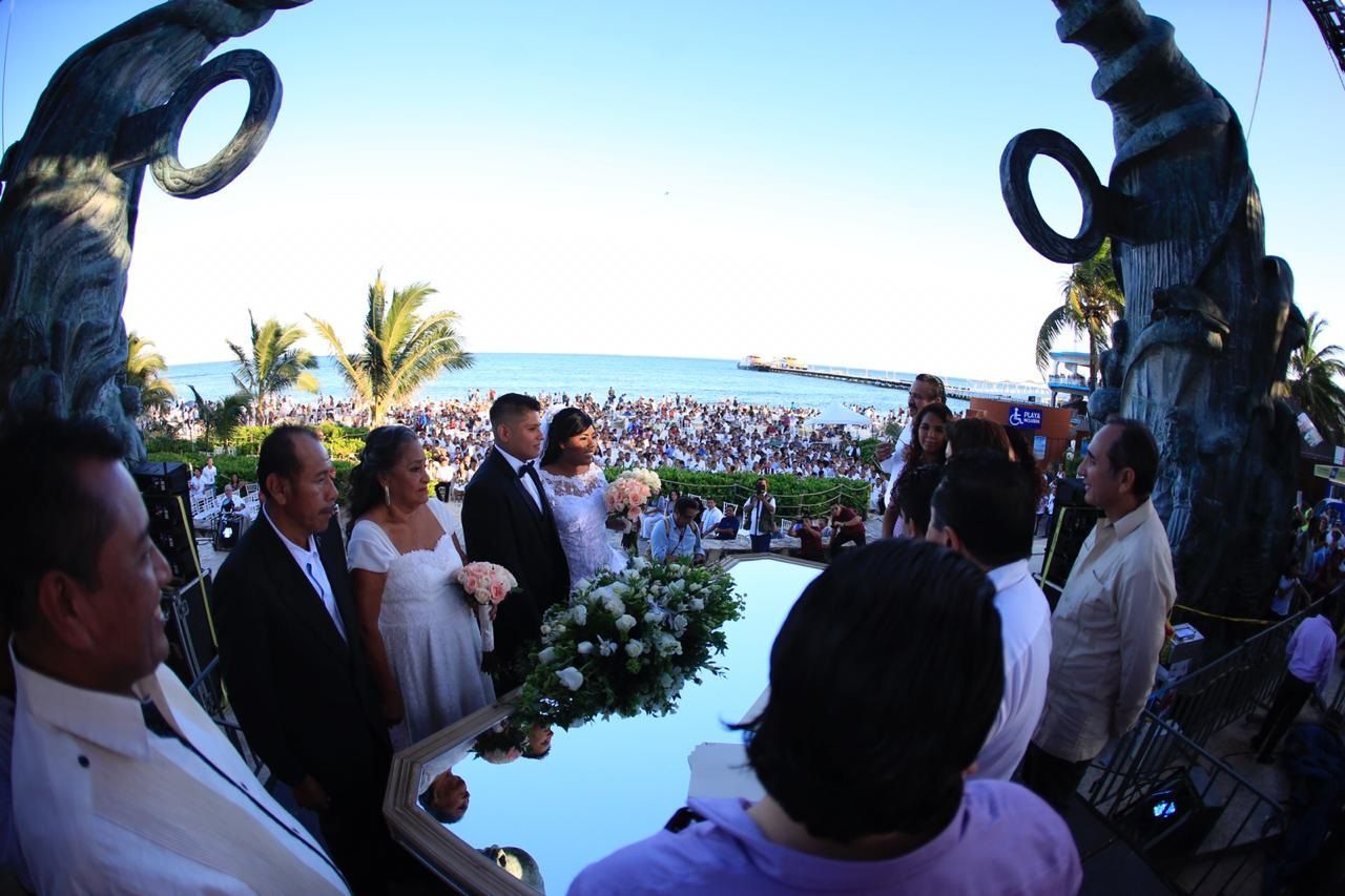 La boda colectiva tuvo lugar en uno de los lugares más espectaculares de Playa del Carmen, bajo la escultura del “Portal Maya”, que se ubica en Playa Caribe, a un costado del muelle fiscal, lugar donde disfrutaron los novios de un bello atardecer.
