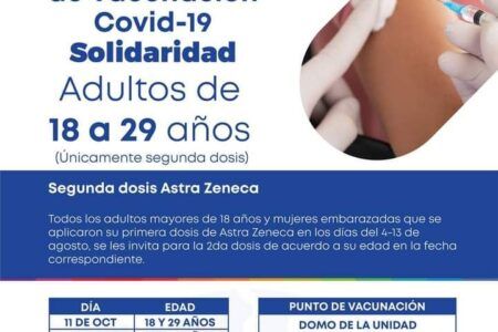 Arranca este lunes 11 de octubre la vacunación para personas de 18 a 29 años, ésto, gracias a las gestiones que la presidenta de Solidaridad, Lili Campos Miranda, realizó para obtener un lote de dosis de vacunas de AstraZeneca, resguardando así la salud de las y los solidaridenses.