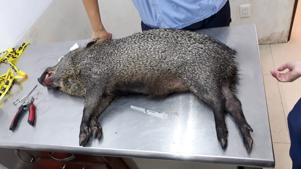 El jabalí de aproximadamente un metro de largo fue sedado por personal especializado para realizarle estos estudios y es probable que su reubicación se haga al parque Xcaret, para que pueda recuperarse y vivir dentro de ese espacio.