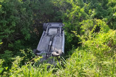 Vuelca vehículo al reventar un neumático cerca de Pammul.