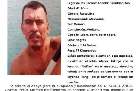 Se pide su ayuda para localizar a Miguel Ángel Capelín Pech de 42 años desaparecido el día 17 de febrero del año en curso en Bacalar Quintana Roo.