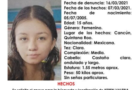 Edad: 15 años. Lugar de los hechos: Cancún, Quintana Roo. Tez: Clara. Complexión: Media. Cabello: Castaño claro, ondulado y largo. Estatura: 1.55 metros aprox. Peso: 50 kilos aprox. Sin señas particulares.