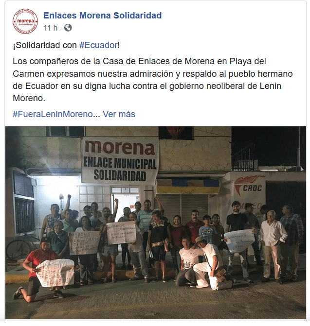 Militancia de morena en Playa del Carmen manda mensaje de apoyo al pueblo de Ecuador