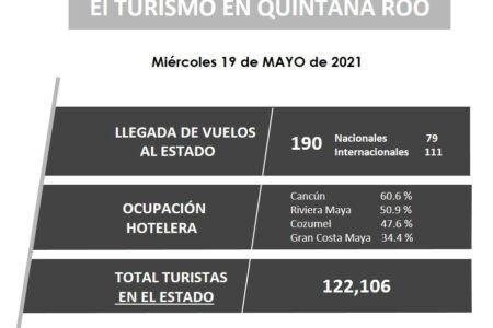 Dado a conocer a través del reporte semana de la Sedetur, se anunció la llegada de 122 mil 106 turistas en total a Quintana Roo y con ello, la entrada a los aeropuertos del estado de 190 vuelos así como el aumento de cifras en ocupación hotelera.