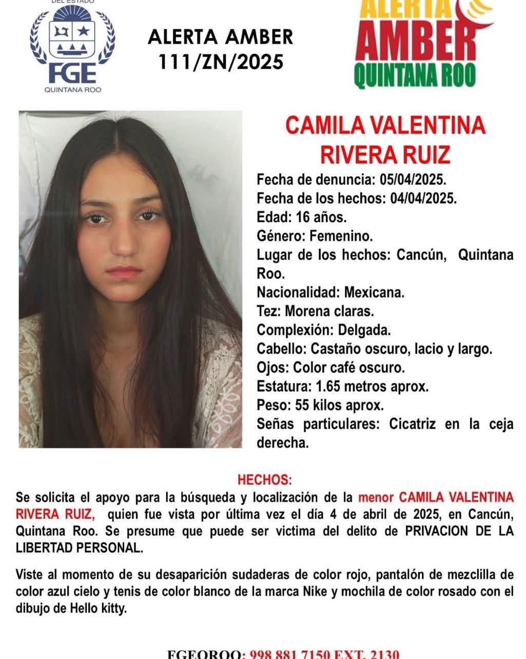 La Fiscalía General del Estado de Quintana Roo activó la Alerta Amber para localizar a Camila Valentina Rivera Ruiz, una joven de 16 años que fue vista por última vez el pasado 4 de abril en la ciudad de Cancún. Desde entonces, su paradero es desconocido.