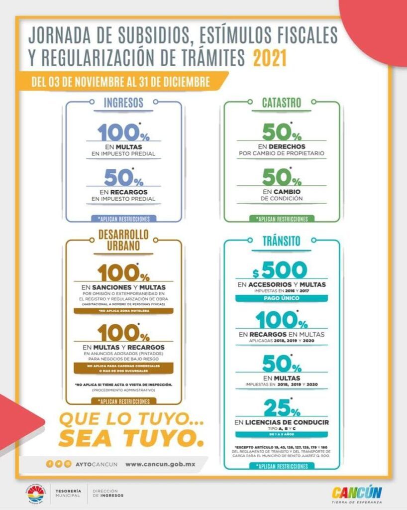 El Ayuntamiento de Benito Juárez realiza la Jornada de Subsidios, Estímulos Fiscales y Regularización de Trámites 2021, desde el 3 de noviembre al 31 de diciembre, la primera estrategia de este tipo que corresponde a la administración 2021-2024 y que incluye la participación de cuatro dependencias municipales con diferentes apoyos.