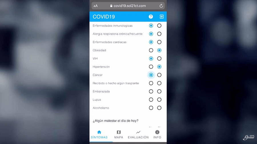 La aplicación, desarrollada en el LINX, funciona a partir de un breve cuestionario de síntomas y factores de riesgo de los usuarios; con esta información se hace una evaluación y se estima la posibilidad de ser contagiado con COVID-19.