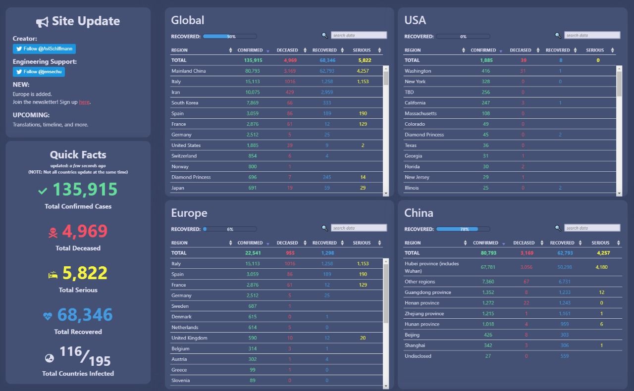 Según una gráfica publicada por @Laurie_Garrett, periodista y autora científica estadounidense, Premio Pulitzer de Periodismo Explicativo en 1996 por una serie de trabajos publicados en Newsday, que narran el brote del virus del Ébola en Zaire, en el mundo existen 135,915 casos confirmados de Covid 19, de los cuales 4,969 han muerto, 5,822 se encuentran bajo condición seria y 68,346 se han recuperado.