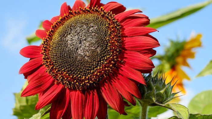 Los hay también de color rojo. Algunos de ellos tienen cabezas similares a margaritas que a menudo nacen de los comunes girasoles amarillos.