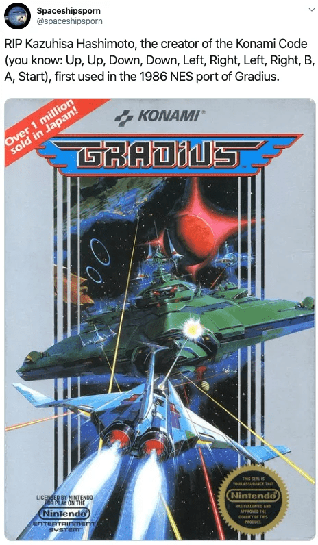 El Código Konami se introdujo por primera vez en 1986, después de que Hashimoto se insertó en Gradius después de encontrar el juego NES demasiado difícil de jugar durante las pruebas. El código utilizó la entrada arriba, arriba, abajo, abajo, izquierda, derecha, izquierda, derecha, B, A, Inicio, y le otorgó al jugador un conjunto completo de potenciadores.