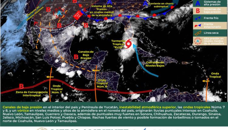 Para hoy, el país será afectado por los siguientes sistemas meteorológicos: canales de baja presión sobre el interior del país y Península de Yucatán, inestabilidad atmosférica superior, el paso de las ondas tropicales Núms. 7 y 8, y un vórtice en niveles medios y altos de la atmósfera en el noreste del país. Por lo que se pronostican lluvias puntuales intensas en Coahuila, Nuevo León, Tamaulipas, Guerrero y Oaxaca, además de puntuales muy fuertes en Sonora, Chihuahua, Zacatecas, Durango, Sinaloa, Jalisco, Michoacán, San Luis Potosí, Puebla y Chiapas. Rachas fuertes de viento y posible formación de torbellinos o tornados en el norte de Coahuila, Nuevo León y Tamaulipas.