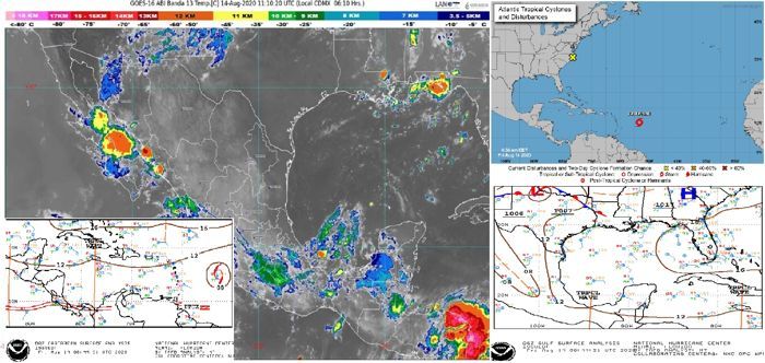 Durante la tarde, un canal de baja presión en el sur del Golfo de México asociado con divergencia en la atmósfera superior, incrementará el potencial de lluvias en el sureste del país y la Península de Yucatán.