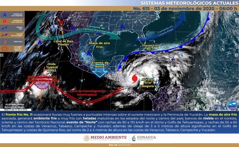 Este día, el frente frío No. 11 se mantendrá sobre el sureste mexicano y la Península de Yucatán, en donde ocasionará lluvias muy fuertes a puntuales intensas.
