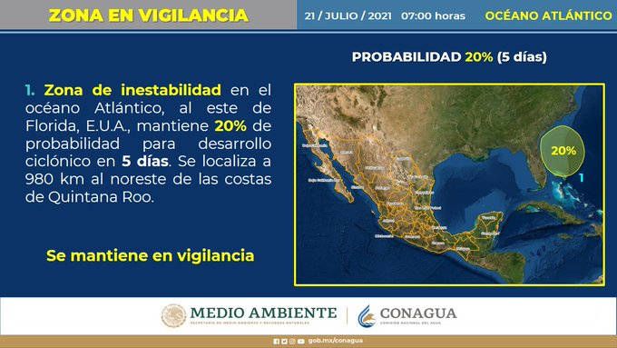 En el océano #Atlántico, la zona de inestabilidad que se ubica a 980 km al noreste de las costas de #QuintanaRoo, mantiene 20% de probabilidad para desarrollo ciclónico en 5 días, pic.twitter.com/Iz5JASPLQC