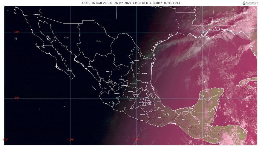 Pacífico Centro: Cielo parcialmente nublado durante el día, sin lluvia en la región. Ambiente frío por la mañana sobre zonas serranas y caluroso durante la tarde. Viento del noroeste de 15 a 30 km/h.