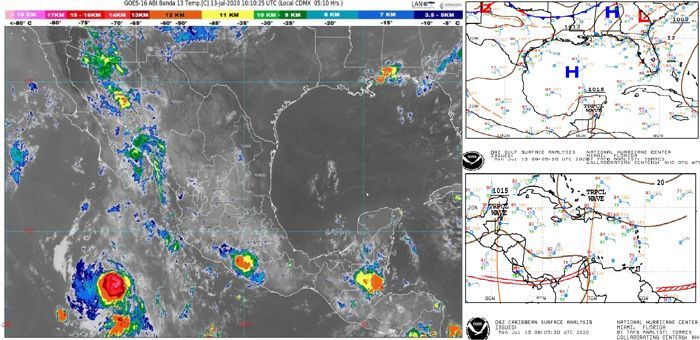 La onda tropical No. 16 y otro canal de baja presión extendido sobre la Bahía de Campeche, ocasionarán chubascos, descargas eléctricas y ráfagas de viento al paso de las tormentas en la Península de Yucatán y lluvias puntuales fuertes en el sureste del país.