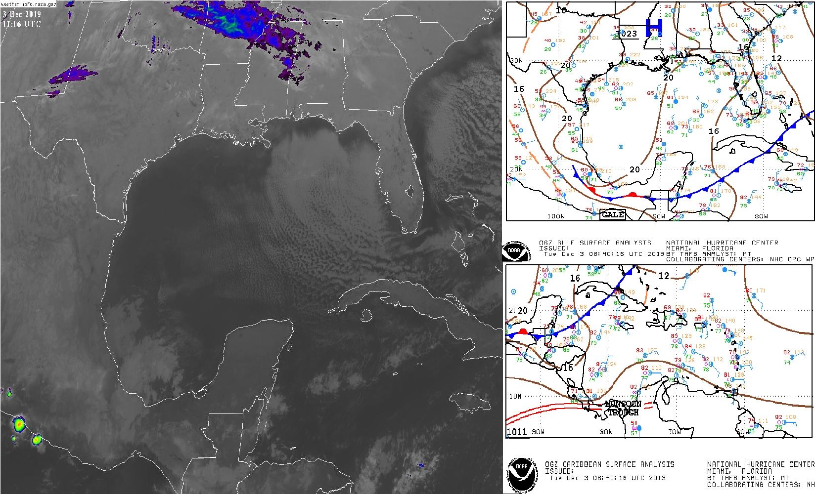 El Golfo de México tendrá cielo nublado la mayor parte del día con bancos de niebla en zonas serranas, intervalos de chubascos en Veracruz y Tabasco. Ambiente cálido y viento de componente este de 10 a 25 km/h.