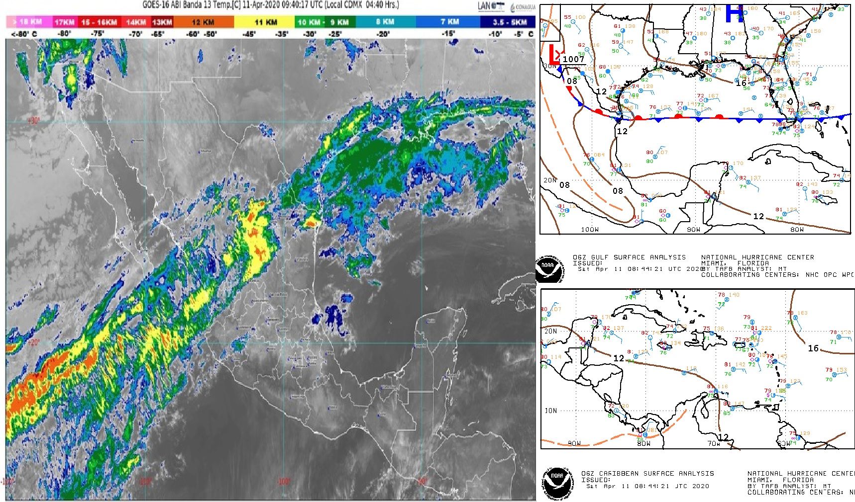 El frente No. 50 adquirirá características cálidas en el norte del Golfo de México, dejando de afectar al país. Un sistema de alta presión en niveles medios de la atmósfera, mantendrá temperaturas calurosas a muy calurosas sobre entidades del occidente, centro, oriente, sur y sureste de la República Mexicana, incluida la Península de Yucatán, con temperaturas superiores a 35°C en 23 entidades del país, pudiendo rebasar los 45°C en zonas de Chiapas, Tabasco, Campeche y Yucatán.