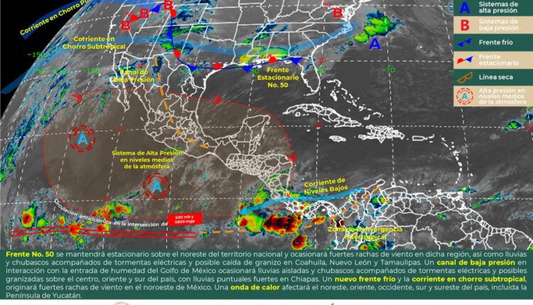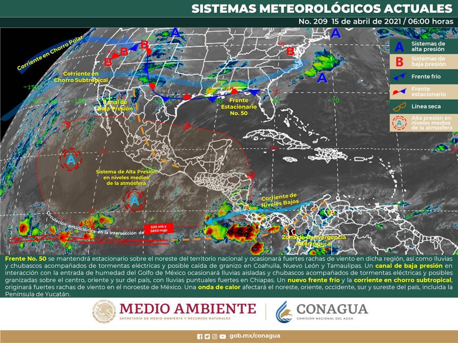 Un canal de baja presión en interacción con la entrada de humedad del Golfo de México y con el calentamiento diurno, ocasionarán lluvias aisladas y chubascos vespertinos acompañados de tormentas eléctricas y posibles granizadas sobre entidades del centro, oriente y sur del país, con lluvias puntuales fuertes en Chiapas. Asimismo, la aproximación de un nuevo frente frío, en interacción con la corriente en chorro subtropical, originará fuertes rachas de viento en el noroeste de México.