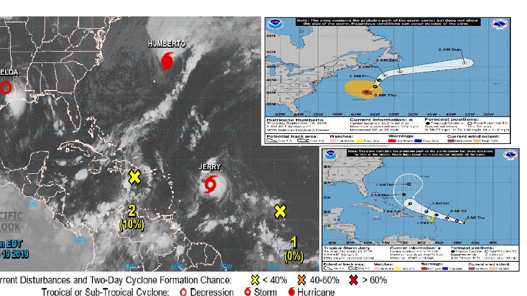 La Tormenta Tropical “HUMBERTO”, en el transcurso de la noche evolucionó a Huracán Categoría CUATRO, del Océano Atlántico, según la escala Saffir-Simpson, localizándose a las 05:00 horas el día de hoy , en las coordenadas 35.2° grados latitud norte y 62.2° longitud oeste, aproximadamente a 400 kms., al noreste de Bermudas, se mueve al noreste (45° grados) a razón de 35 kph, con vientos máximos cerca del centro de 225 kph, con rachas mayores, por su distancia y dirección de movimiento futuro no representa ningún riesgo para las costas nacionales, se le da seguimiento.