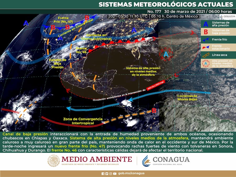 Finalmente, por la tarde-noche un nuevo frente frío (No. 47), ingresará sobre el noroeste y norte de México, ocasionando rachas fuertes de viento con tolvaneras en Sonora, Chihuahua y Durango.
