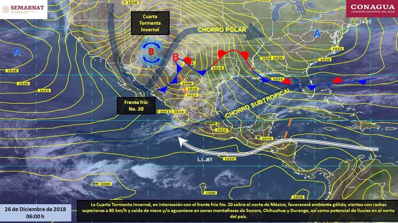 En el Golfo de México se prevé cielo nublado, ambiente frío, bancos de niebla en zonas montañosas de Veracruz y evento de Norte con rachas superiores a 50 km/h en el sur de Veracruz y Tabasco.
