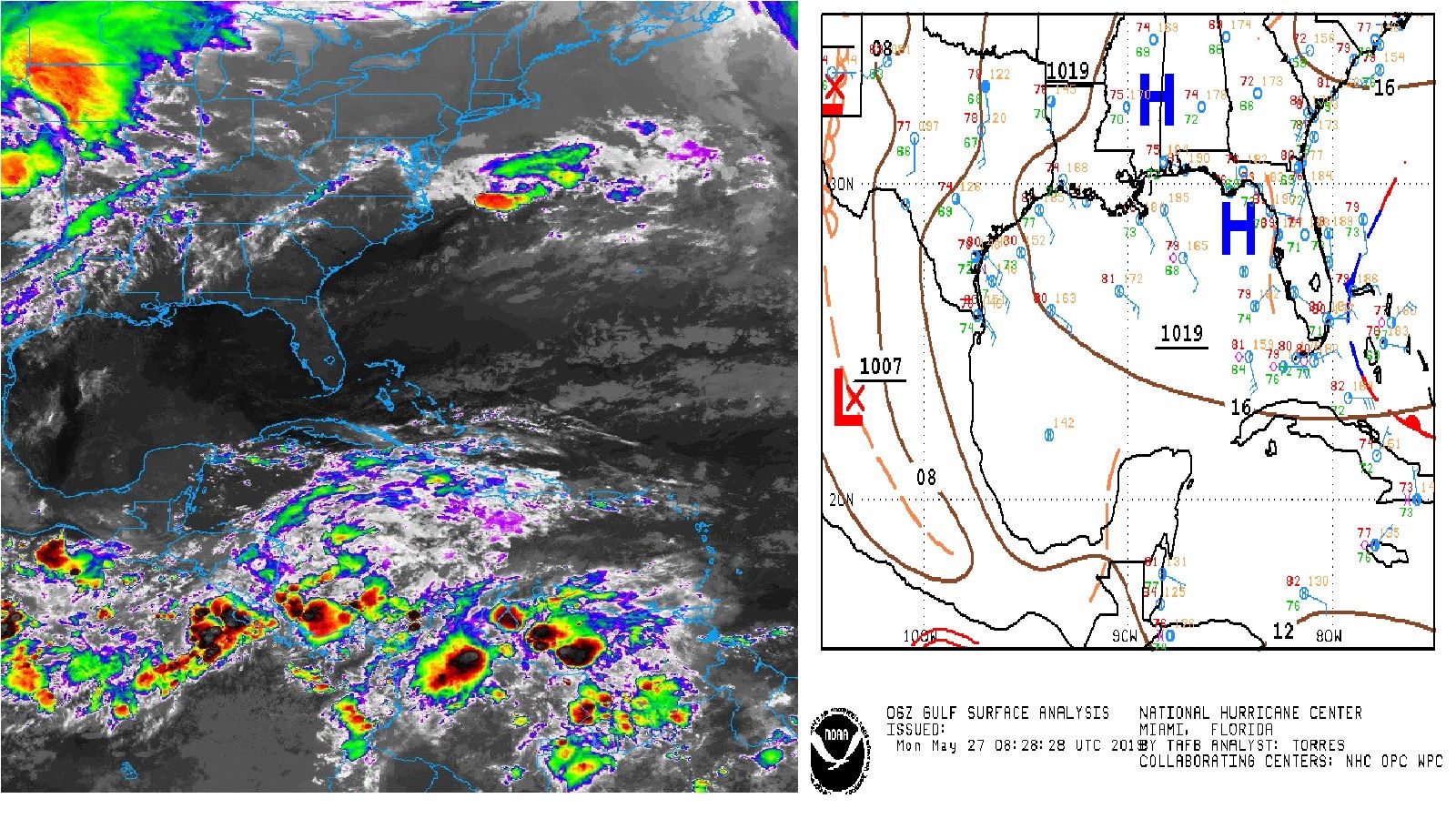 Se mantiene Sistema Anticiclónico débil (Alta Presión) localizada en superficie sobre el sureste de los Estados Unidos de Norte-América; en su muy amplia circulación periférica está impulsando Aire Marítimo Tropical con variable contenido de humedad procedente del Mar Caribe hacia la Península de Yucatán; está manteniendo las temperaturas calurosas a bochornosas, un gradual incremento de nubosidad y lluvias aisladas con chubascos ocasionales dispersos en zonas de la región Peninsular y del Estado de Quintana Roo; más frecuentes después de mediodía.