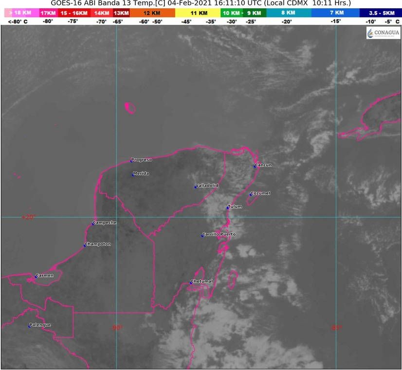Dijo que con base en el reporte de temperaturas mínimas de las estaciones convencionales de las 09:00 horas del 03/02/2021 a las 09:00 horas del 04/02/2021, la cabecera municipal de Felipe Carrillo Puerto registró 10.8 grados.
