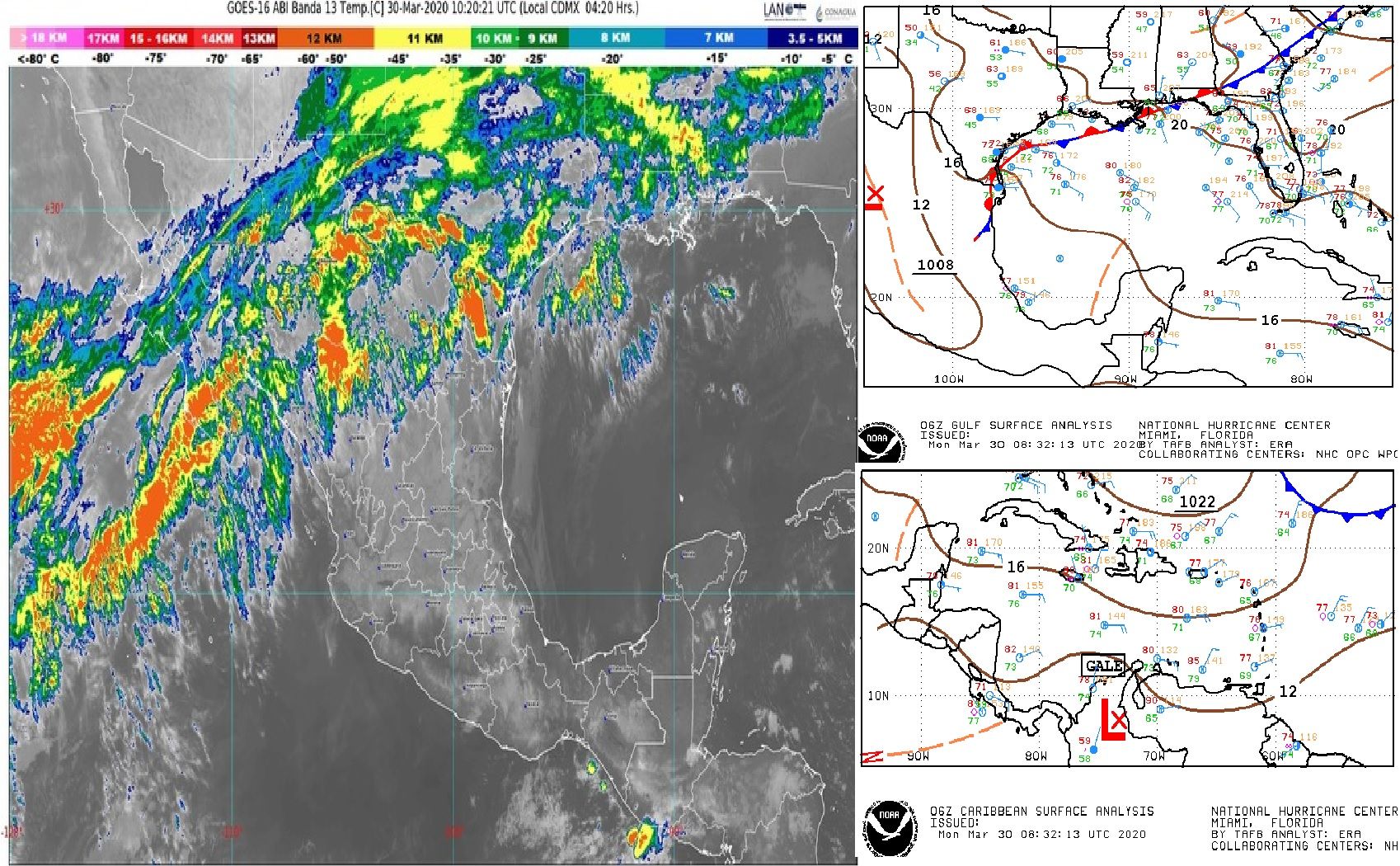 Golfo de México: Cielo nublado con lluvias aisladas en Tamaulipas y Veracruz. Bancos de niebla dispersos. Ambiente muy caluroso en el sur de la región. Viento de componente este de 15 a 30 km/h con rachas de 40 a 50 km/h en Tamaulipas.