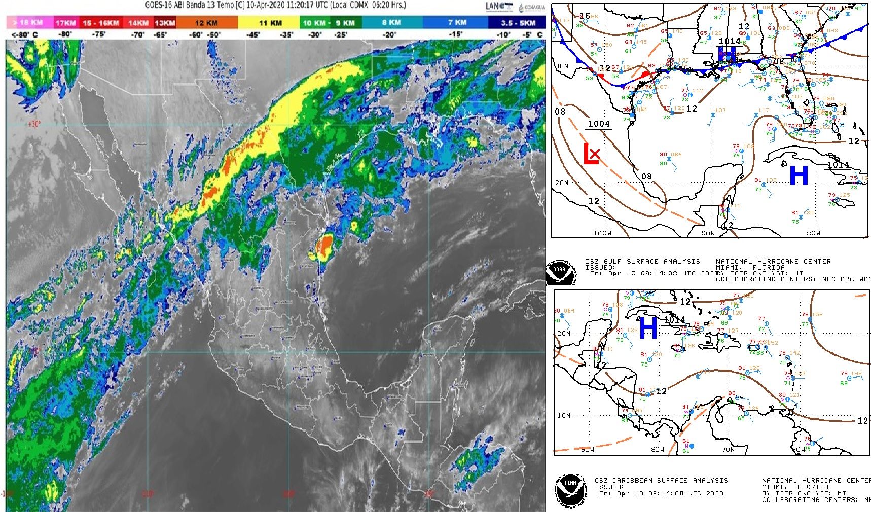 El frente frío No. 50 se extenderá sobre el noreste del territorio nacional y en interacción con un canal de baja presión sobre el oriente del país y con la entrada de humedad del Océano Pacifico que genera la corriente en chorro, originará lluvias fuertes a puntuales muy fuertes acompañadas de descargas eléctricas, granizadas y vientos de 60 a 70 km/h con posible formación de torbellinos en Coahuila, Nuevo León y Tamaulipas, además de chubascos en San Luis Potosí, Hidalgo, Puebla y Veracruz. Finalmente un sistema de alta presión en niveles medios de la atmósfera, mantendrá temperaturas calurosas a muy calurosas sobre entidades del occidente, centro, oriente, sur y sureste de la República Mexicana, incluyendo la Península de Yucatán, con temperaturas superiores a 35°C en 22 entidades del país, pudiendo rebasar los 45°C en Chiapas, Tabasco, Campeche y Yucatán.