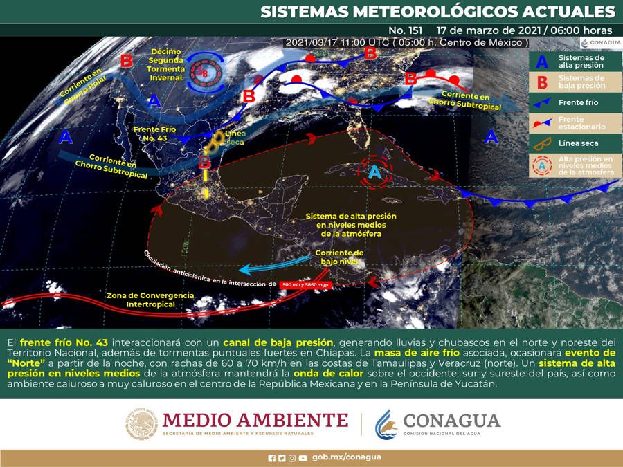 Golfo de México: Cielo parcialmente nublado durante el día, por la tarde se incrementará la nubosidad y se prevén intervalos de chubascos en Veracruz. Sin lluvia en el resto de la región. Ambiente fresco por la mañana y ambiente cálido a caluroso por la tarde en zonas costeras. Evento de “Norte” con rachas de 60 a 70 km/h durante la noche, además de oleaje elevado de 1 a 2 metros de altura significante en las costas de Tamaulipas y Veracruz (norte).