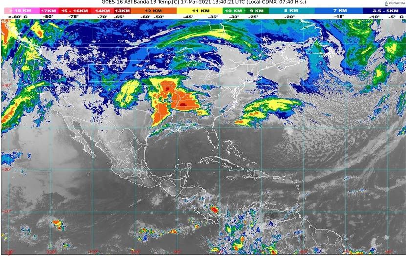 Mesa del Norte: Cielo parcialmente nublado durante el día y nublado con lluvias aisladas en San Luis Potosí. Sin lluvia en el resto de la región. Ambiente muy frío con posibles heladas en zonas serranas. Ambiente cálido a caluroso por la tarde. Viento del oeste y suroeste de 20 a 35 km/h con rachas de 60 a 70 km/h en Coahuila y Nuevo León, así como de 50 a 60 km/h en San Luis Potosí.
