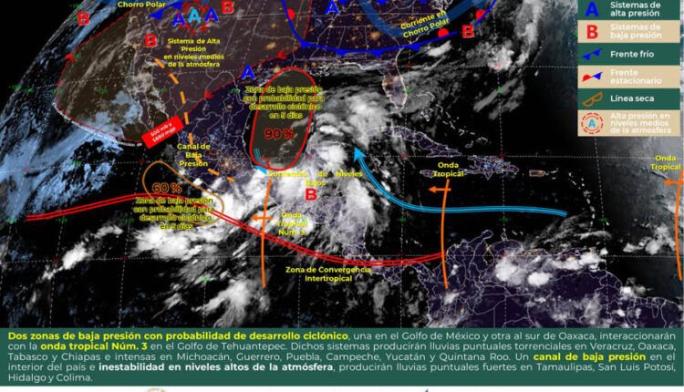 Para hoy, la zona de baja presión con probabilidad de desarrollo ciclónico en el Golfo de México, continuará interactuando con la onda tropical Núm. 3 en el Golfo de Tehuantepec y con otra zona de baja presión con probabilidad de desarrollo ciclónico al sur de Oaxaca; dichos sistemas provocarán lluvias puntuales torrenciales en Veracruz, Oaxaca, Tabasco y Chiapas; intensas en Michoacán, Guerrero, Puebla, Campeche, Yucatán y Quintana Roo.